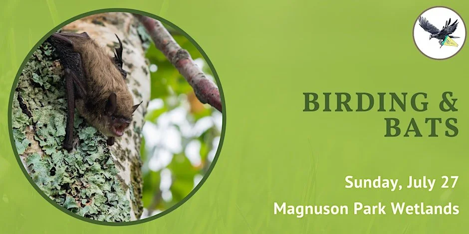 Join us for an evening of birding and bat-spotting at beautiful Magnuson Park on Sunday, July 27 from 7:45-9:30 PM! We'll start at 7:45pm with a welcome circle and some light evening birding, then shift our focus to flying mammals as we welcome a special guest from Bats Northwest to share fascinating insights about local bats and how we can support them.