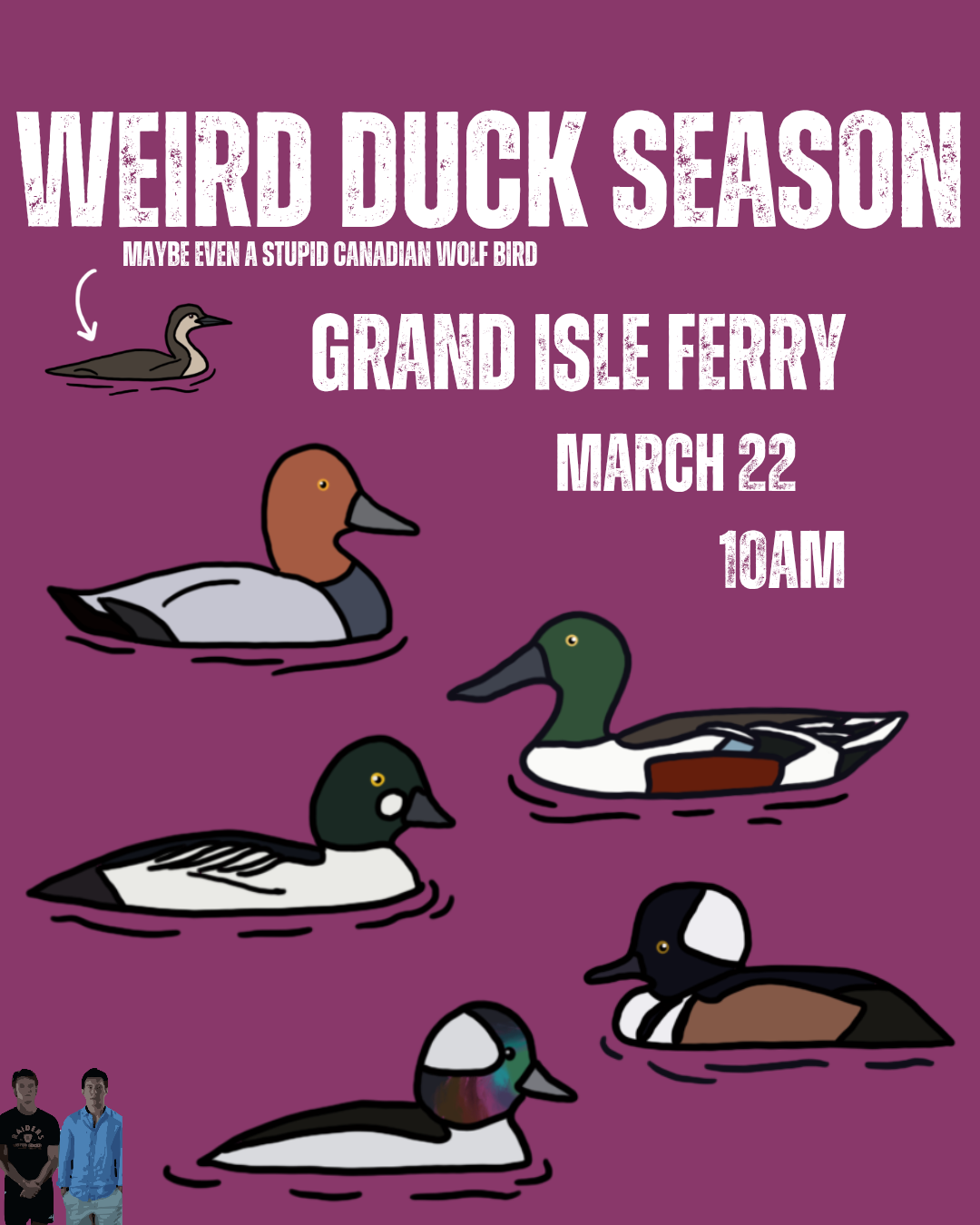 Back to All Events Northern Vermont - Weird Duck Season Sunday, March 22, 2026 10:00 AM 11:30 AM 1268 Gordons Landing Grand Isle, VT, 05458 United States (map) Google Calendar ICS